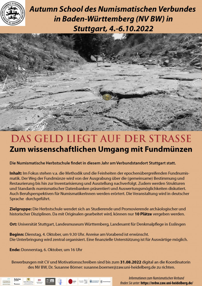 4.-6. Oktober 2022: "Das Geld liegt auf der Straße. Zum wissenschaftlichen Umgang mit Fundmünzen": Autumnschool des Numismatischen Verbundes Baden Württemberg (NVBW) [die Ausschreibung finden Sie hier] #ACHTUNG: die Veranstaltung JETZT nicht statt, sondern wird stattdessen auf's Frühjahr verschoben!#